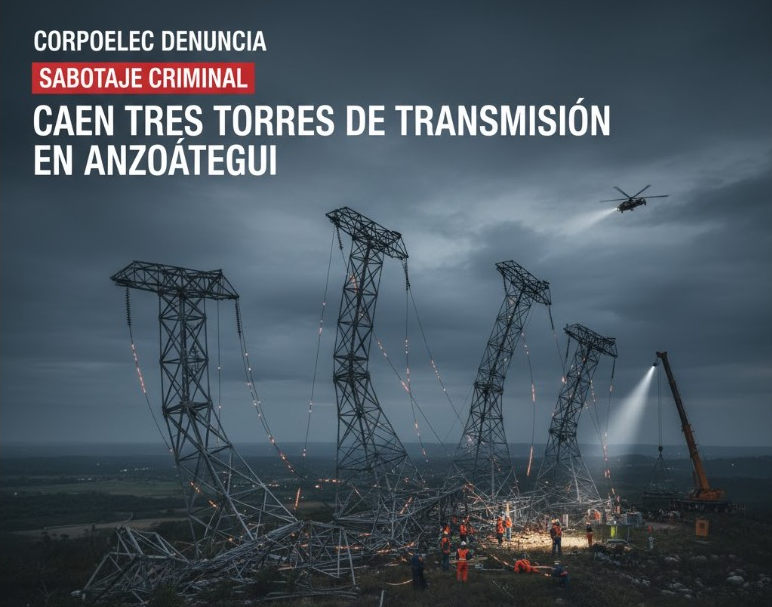 BARCELONA, ANZOÁTEGUI. La Corporación Eléctrica Nacional (Corpoelec) denunció este sábado un nuevo acto de «sabotaje criminal» contra el Sistema Eléctrico Nacional (SEN), que resultó en la caída de tres torres de transmisión en el estado Anzoátegui. Este incidente ha impactado gravemente la estabilidad y el suministro del servicio eléctrico en la región oriental del país.